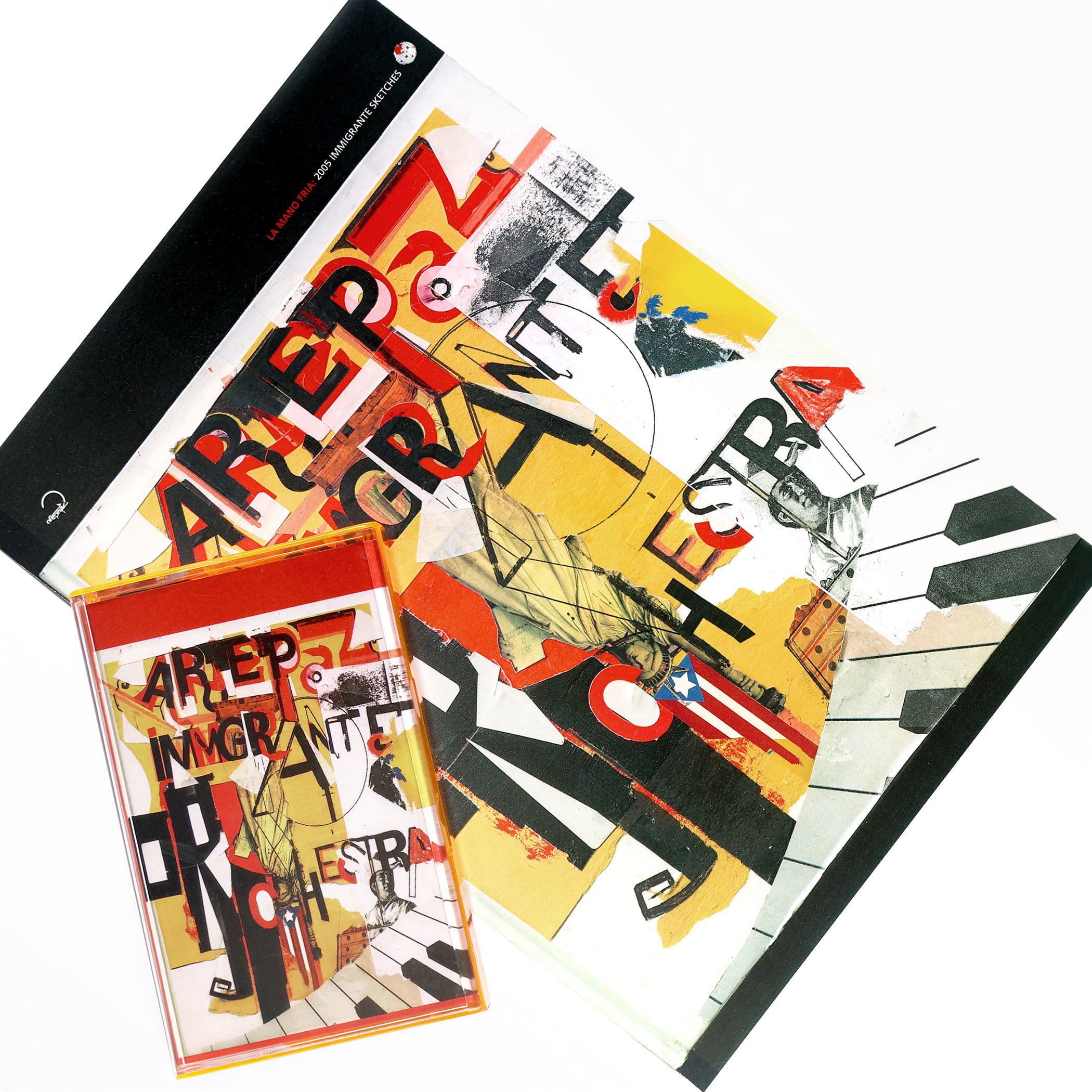 Just another day at the office. (1) Cassette Tape: hand dubbed (real time) on a C-32. 1-sided, 2 panel fold out, full color j-card Tape color: black masa. Inside a clear/transparent orange Norelco case. Shrink wrapped. (1) Design/art book compiling 2005 Arepaz designs (the birth time of Arepaz Records) Entitled, "La Mano Fria: 2005 IMMIGRANTE SKETCHES". Size: A5 (210 mm x 148 mm/8.27 inches x 5.83 inches), 24 page, full color, paperback book. All typography and design by La Mano Fria founder of Beta Bodega Coalition/Arepaz.