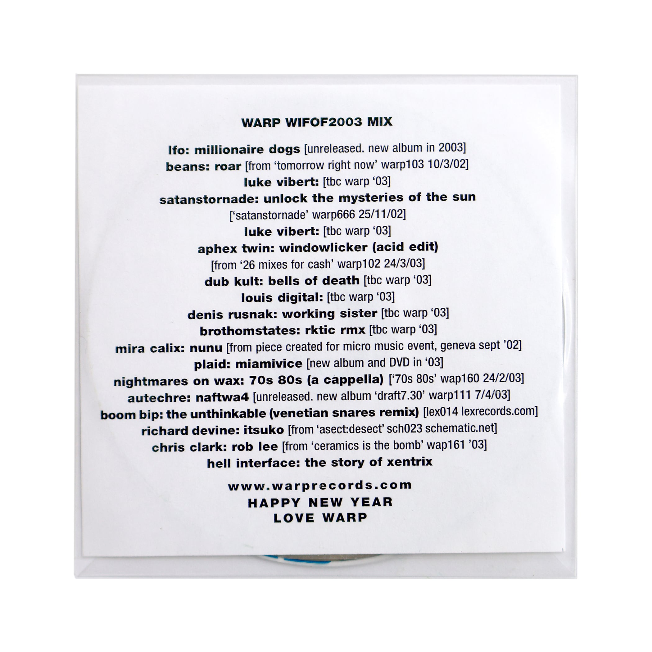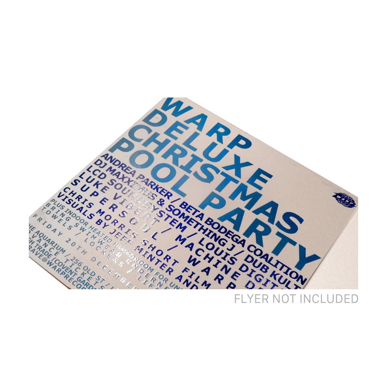 Forty minute mixed sampler CD that was given away to everyone at the Warp Records Christmas pool party, December 20, 2002. Held at the Club Aquarium on Old Street in London, England. The event featured a room with a swimming pool and live performances from artists such as Machinedrum, Beta Bodega Coalition (09, V8 & La Mano Fria), LCD Soundsystem, Supersoul, Something J, Dub Kult, Andrea Parker, Luke Vibert and more. Flyer not included.